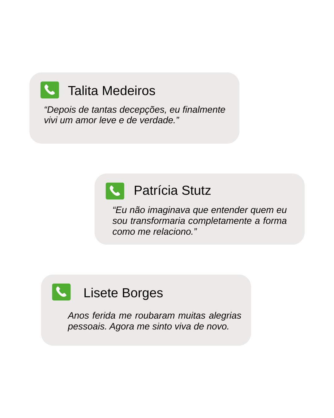 Com um investimento de R$1.000,00, você inicia uma jornada que vai muito além de conselhos sobre relacionamentos — é um processo de reconstrução interior, guiado passo a passo, com acompanhamento individual e confidencial.